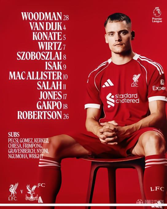 利物浦首发:28-伍德曼、8-索博斯洛伊、5-科纳特、4-范戴克、26-罗伯逊、17-琼斯、10-麦卡利斯特、11-萨拉赫、7-维尔茨、18-加克波、9-伊萨克