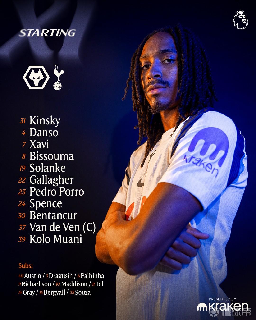 托特纳姆热刺首发:31-金斯基、23-波罗、37-范德芬、4-凯文-丹索、24-斯彭斯、30-本坦库尔、8-比苏马、22-加拉格尔、7-哈维-西蒙斯、19-索兰克、39-穆阿尼