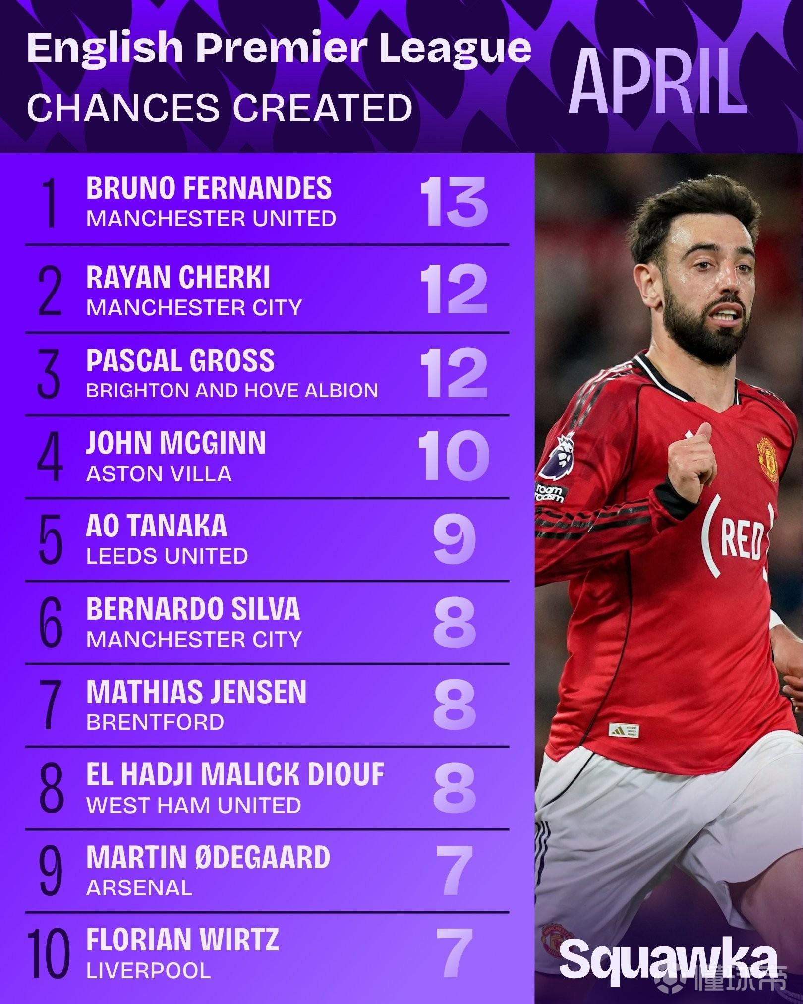北京时间4月30日,知名数据机构Squawka列出了英超4月的创造机会榜,曼联中场布鲁诺-费尔南德斯以13次位居榜首,曼城的谢尔基和布莱顿的格罗斯以12次位列第二。