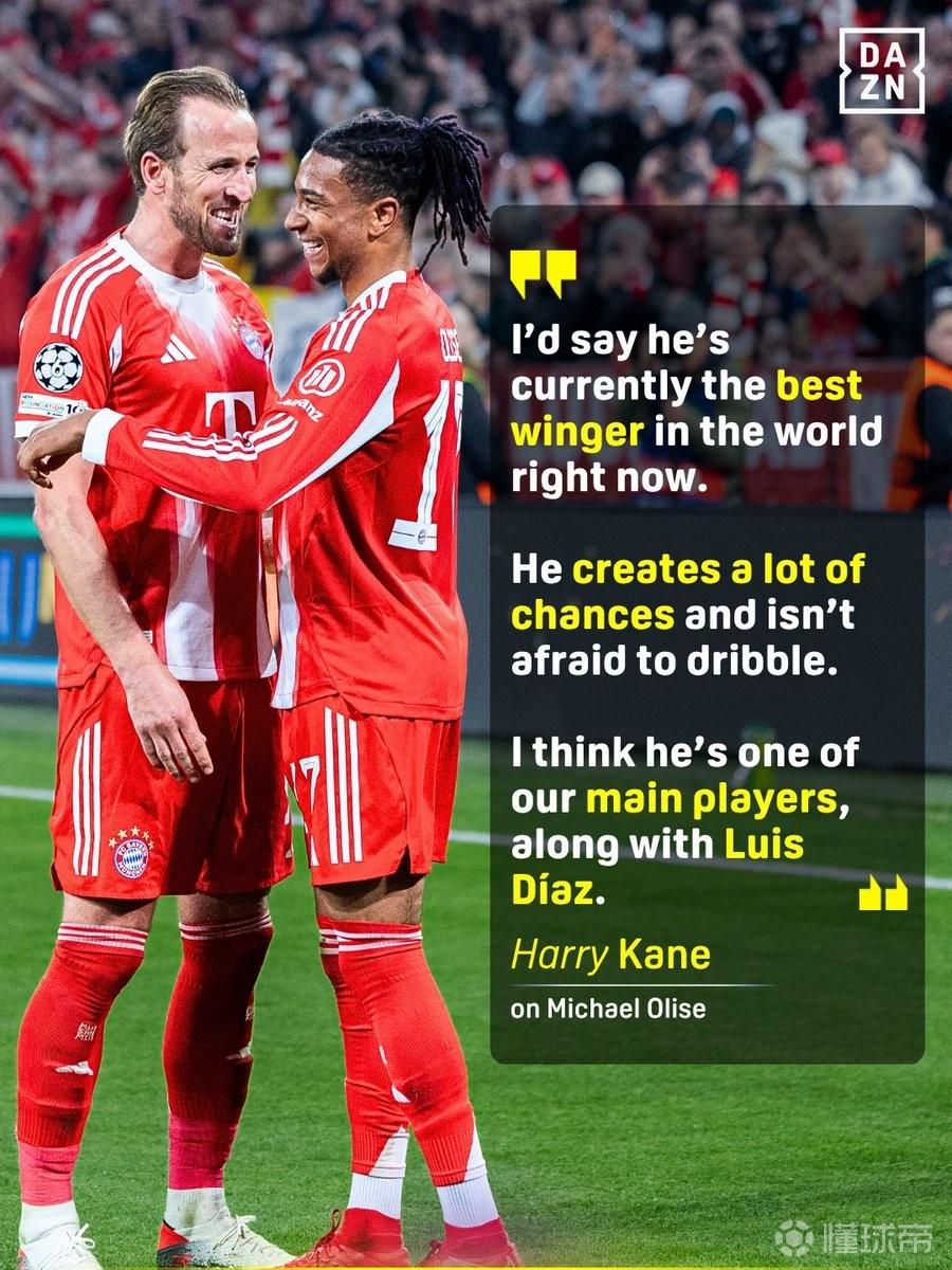 欧冠1/4决赛次回合,拜仁慕尼黑主场4-3逆转击败皇家马德里,凯恩和奥利塞各入一球,赛后,凯恩在接受DAZN的采访时表示,他认为奥利塞是目前世界足坛最佳边锋。